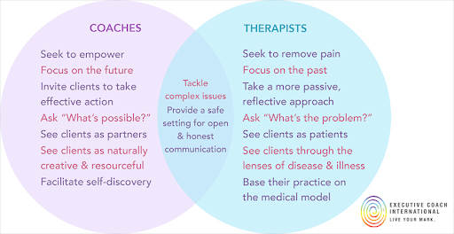 Therapy (also known as psychotherapy, counseling, or “talk therapy”) is similar to coaching in some ways. Both use evidence-based techniques and intentional dialogue as the primary tools for growth and discovery, but there are also key differences between these services: Coaching focuses primarily on the present and future, while therapy focuses on the past, present, and future. Coaching is focused on personal growth and professional development, while therapy involves identifying deeper issues from the past such as anxiety, depression, or trauma, that are creating problems in one’s life, preventing them from moving forward.